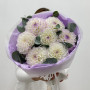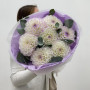 На фото букет из 7 бело-лиловых георгин с эвкалиптом. В составе: георгина 7 шт, эвкалипт 3 шт, дизайнерская упаковка 1 шт, атласная лента 1 шт, . Все цветы свежие и ароматные, букет красиво оформлен и отлично подходит для подарка. Доступна доставка цветов или самовывоз.